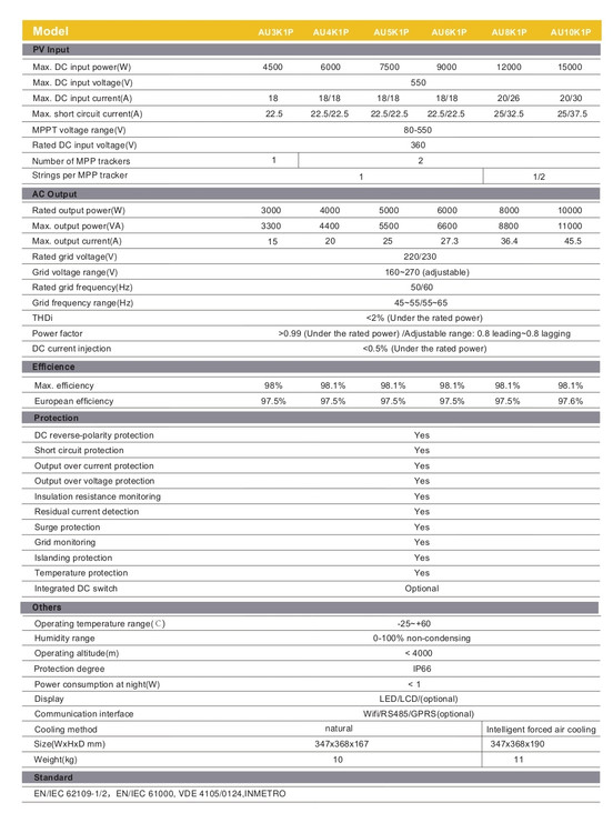 Standard : EN/IEC 62109-1/2,EN/IEC 61000, VDE 4105/0124,INMETRO